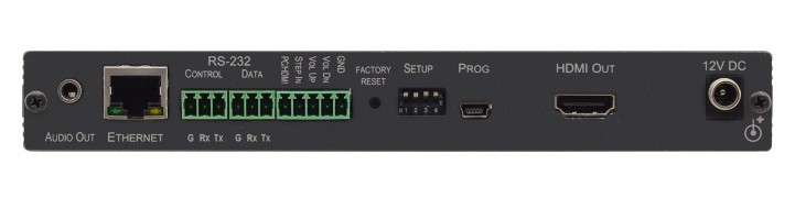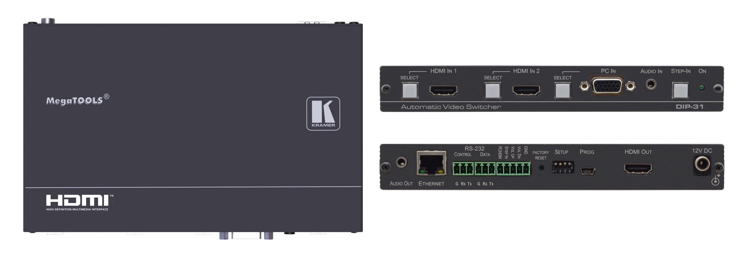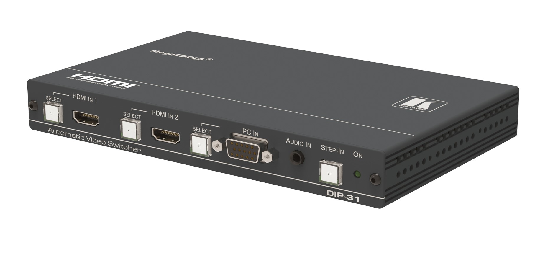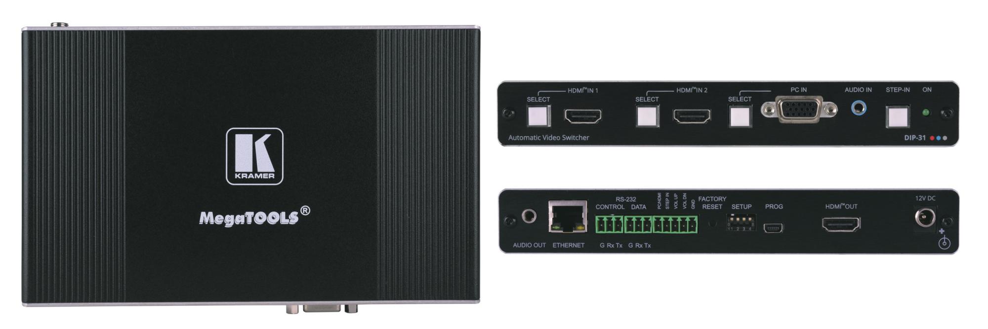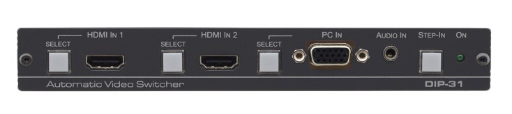 DIP-31 — передатчик по кабелю HDMI c функцией выбора входа на удаленном коммутаторе по технологии Step-in. В устройстве имеются переключаемые автоматически или вручную входы 2хHDMI и VGA, а также вход аналогового небалансного стерео аудио. Прибор преобразует сигнал с любого из выбранных видеовходов в выходной сигнал HDMI.В приборе также имеются порты Ethernet и RS-232, которые могут использоваться как для управления устройством, так и для передачи/приема данных по линии HDMI. Прибор осуществляет эмбедирование аудио, поступающего на небалансный аналоговый вход, в выходной сигнал, а также вывод деэмбедированного из HDMI аудио на небалансный стереовыход. Имеется функция выбора входа на удаленном коммутаторе, реализуемая нажатием кнопки Step-in или замыканием «сухих контактов». Благодаря встроенной в прибор системе Kramer Maestro может осуществляться автоматизация работы различных устройств в помещении.