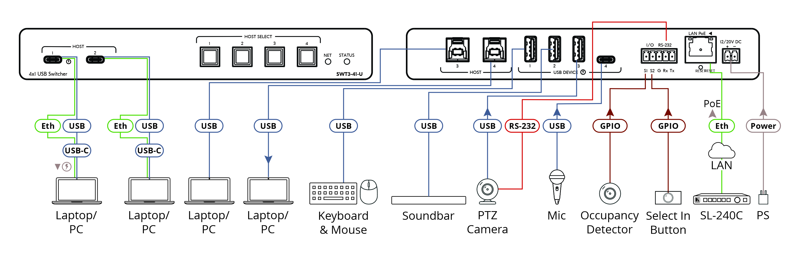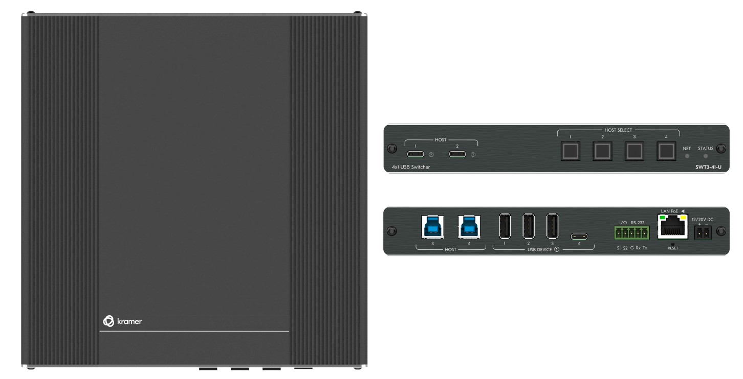SWT3-41-U — коммутатор, оснащённый 4 портами (2 USB−C + 2 USB-B) для активных USB-хостов, к которым могут подключаться локальныепериферийные устройства посредством 4 портов (3 USB-A + USB-C). В приборе предусмотрены как ручной выбор хоста, так и автоматическое переключение на хост с приоритетом или на порт с последним по времени подключения активным хостом.