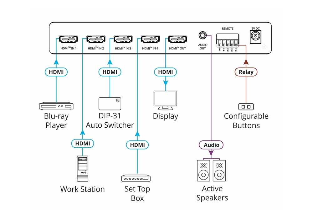 - Автоматическое деэмбедирование аудио из сигнала HDMI на выходе коммутатора: аудиосигнал преобразуется в аналоговый формат и поступает на небалансный стерео аудиовыход прибора, параллельно с этим аудио воспроизводится внешними или встроенными громкоговорителями потребителя сигнала HDMI (например ТВ-приемника со встроенной акустической системой)
