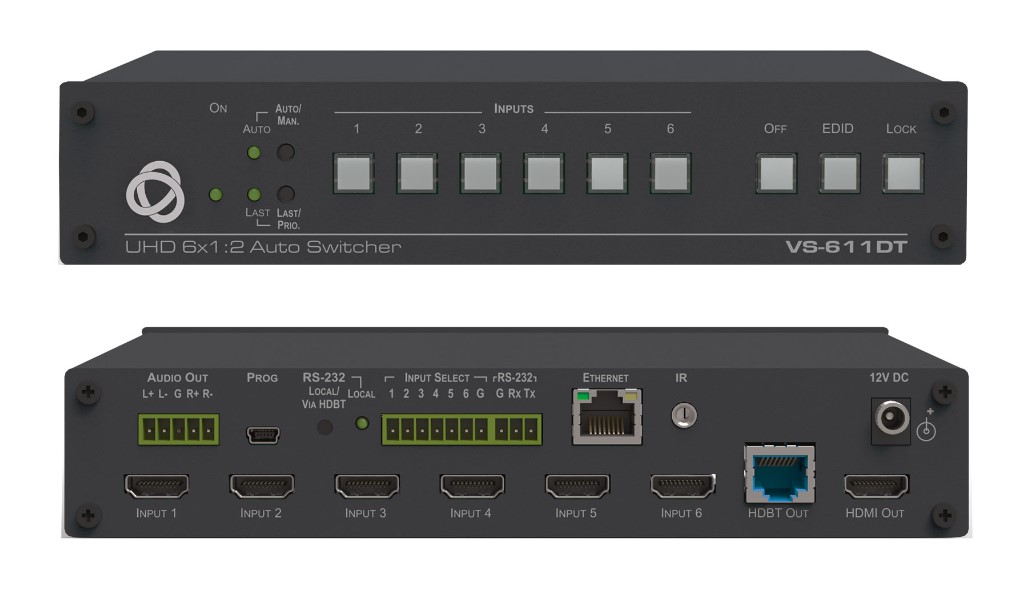 VS-611DT — коммутатор 6х1 HDMI c автоматическим или ручным переключением входов и выводом сигнала одновременно на два выхода: HDMI и HDBaseT. Обеспечение PoE-питания для совместимых приемников. Поддержка разрешений до 4K@60 Гц (4:2:0). Выбор одного из двух режимов автоматического переключения: на вход с более высоким приоритетом или вход с последним по времени подключения источником сигнала.