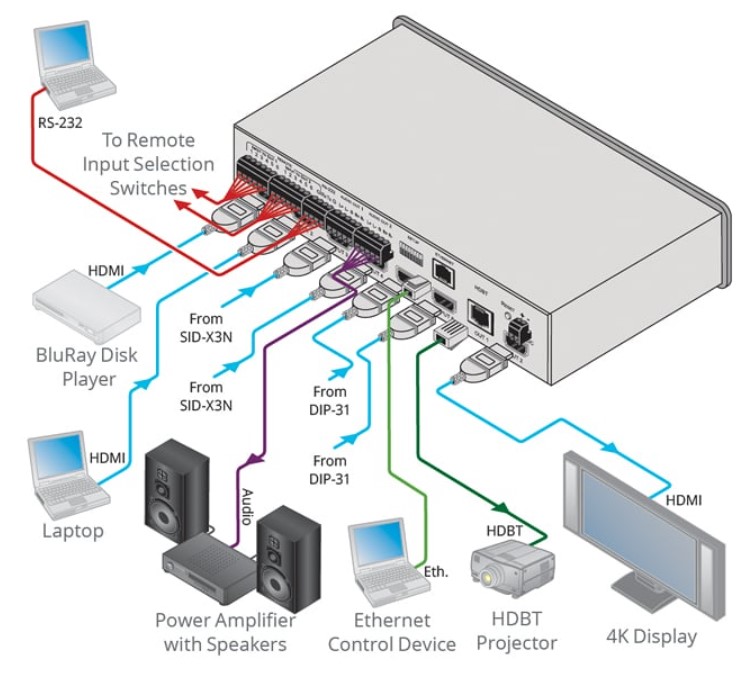 - Возможность удаленного управления по интерфейсам RS-232 или Ethernet при помощи последовательных команд с использованием протокола Kramer Protocol 3000, а также с использованием встроенных веб-страниц