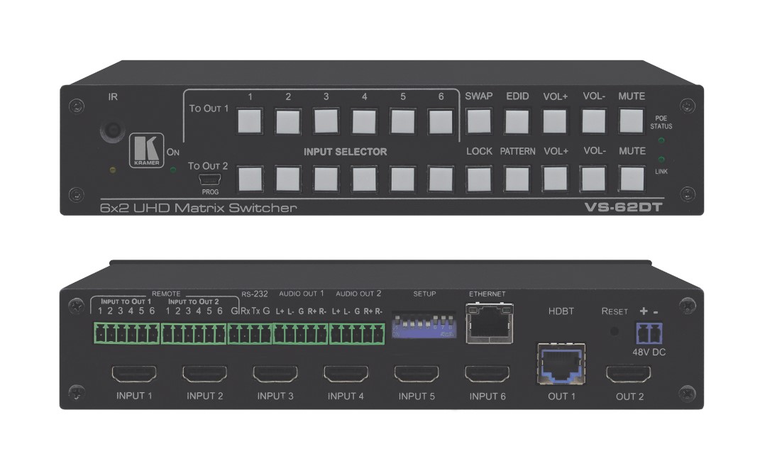 VS-62DT — матричный коммутатор 6х2 HDMI c автоматическим или ручным переключением входов и независимыми выходами HDMI и HDBaseT с поддержкой разрешений до 4K@60 Гц (4:2:0). Прибор осуществляет перетактирование входного сигнала, компенсацию АЧХ кабеля и переключение сигнала HDMI от любого из шести источников на любой из двух выходов: HDMI или HDBaseT, или на оба выхода одновременно. Выбор одного из двух режимов автоматического переключения: на вход с приоритетом или вход с последним по времени подключения источником сигнала. Возможность дистанционного ручного переключения входов. Режим удаленного выбора входа коммутатора по технологии Step-in, настраиваемый отдельно для каждого выхода. Прибор является источником питания PoE по линии HDBaseT для совместимых приемников, например, TP−580RXR.