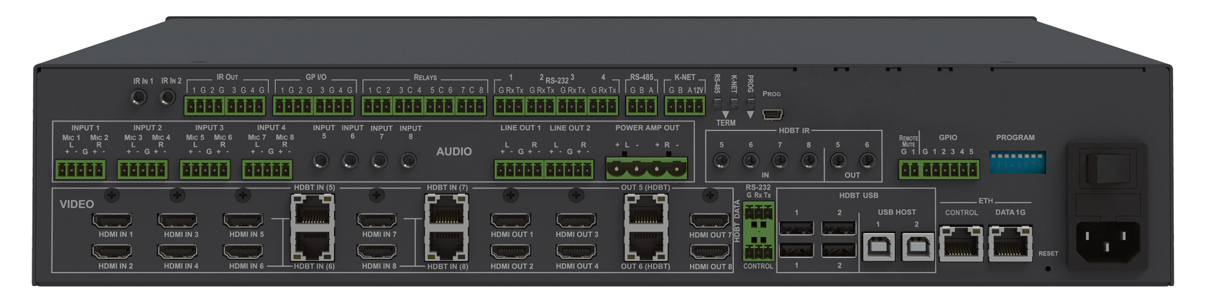 4 HDMI4 входа HDMI и 4 входа HDMI/HDBaseT (RJ-45) по выбору4 небалансное стерео аудио (mini-jack 3,5 мм)4 балансное стерео аудио/8 балансный микрофонный вход (5/3-конт. блок съемных клемм)6 ИК (mini-jack 3,5 мм) для туннелирования в сигнал HDBaseT2 ИК (mini-jack 3,5 мм) — входы контроллера помещения |
