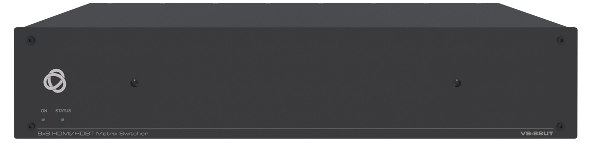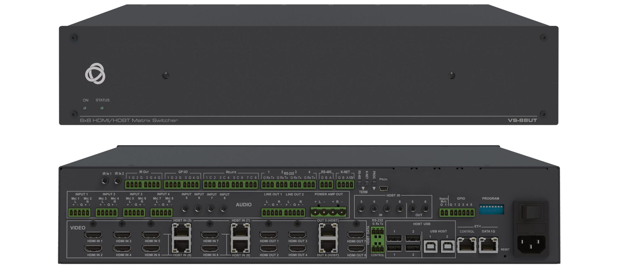 VS-88UT — универсальная презентационная система, объединяющая в себе матричный коммутатор сигналов HDMI, HDBaseT 2.0 и аналогового аудио, встроенный главный контроллер помещения и усилитель мощности. Прибор осуществляет коммутацию видеосигналов с разрешением до 4K@60 Гц (4:2:0), а также балансных и небалансных аудиосигналов, обеспечивает деэмбедирование и эмбедирование аналогового аудиосигнала в выходной сигнал HDMI и HDBaseT 2.0. VS-84UT обеспечивает двустороннюю передачу сигналов USB, ИК, RS-232 и Ethernet, а также питание совместимых приемников по технологии PоE по единой линии HDBaseT . Встроенный усилитель мощности позволяет воспроизводить выходной аудиосигнал при помощи непосредственно подключаемых громкоговорителей. Встроенный главный контроллер помещения обеспечивает удаленное управление аудио-видео и иным оборудованием через сеть Ethernet c помощью портов двунаправленных сигналов управления RS-485 (1) и RS-232 (4), портов ИК (4), портов ввода-вывода GPI/O (4) и реле типа «сухие» контакты (4). Контроллер поддерживает сеть K-NET™ для подключения вспомогательных устройств управления Kramer Electronics, таких как кнопочные панели.
