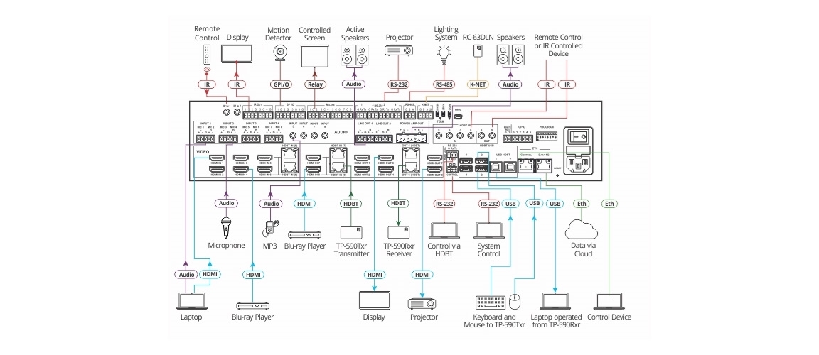 - Встроенный главный контроллер помещения с набором интерфейсов управления: 2 входа/2 выхода ИК, 4 порта ввода-вывода общего назначения (GPI/O), 4 двухконтактных реле, 4 порта RS-232 и 1 порт RS-485