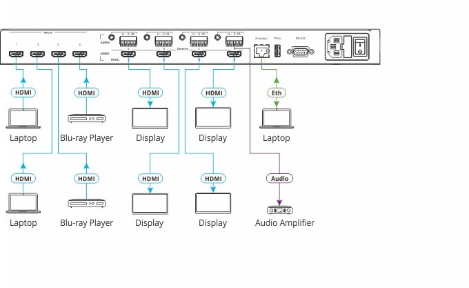 - Балансные и небалансные аудиовыходы для каждого выхода HDMI