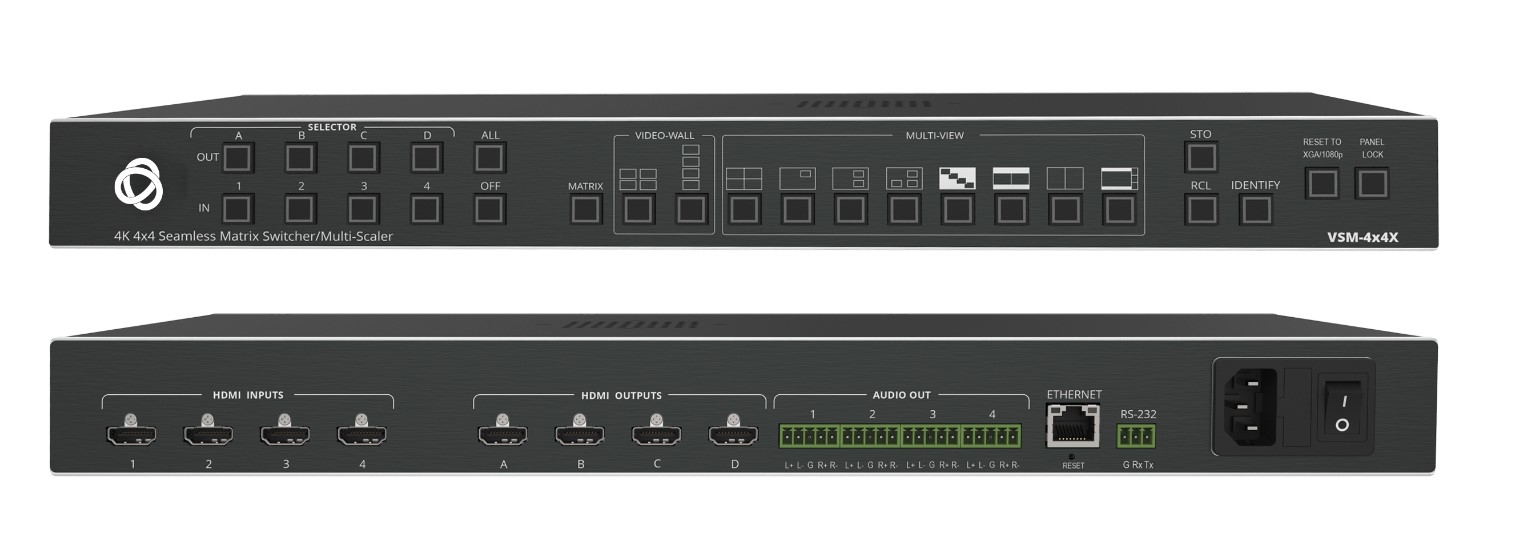 VSM-4×4X — матричный коммутатор 4×4 HDMI c бесподрывным переключением входов, который также может работать в качестве контроллера видеостены (2×2 или 1×4) или мультиоконного процессора с поддержкой различных конфигураций до 4 изображений на общем экране. Устройство поддерживает разрешения до 4K60 (4:4:4) в соответствии со спецификацией HDMI 2.0. VSM-4×4X позволяет осуществлять индивидуальную настройку поддержки HDCP и работу с EDID на каждом входе, а также деэмбедирование аудио на каждом выходе.