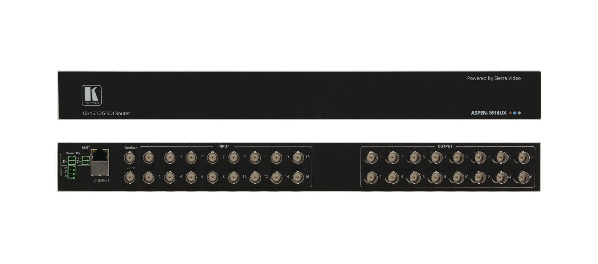 Aspen-1616UX – матричный коммутатор 16х16 сигналов SDI со скоростью до 12G UHD-SDI (12 Гбит/с) c функцией компенсации AЧХ кабеля на входе и перетактирования и восстановления сигнала на выходе, а также возможностью удаленного управления по локальной сети с использованием удобных встроенных веб-страниц или посредством интерфейса RS-232 c использованием внешнего контроллера с последовательным интерфейсом.