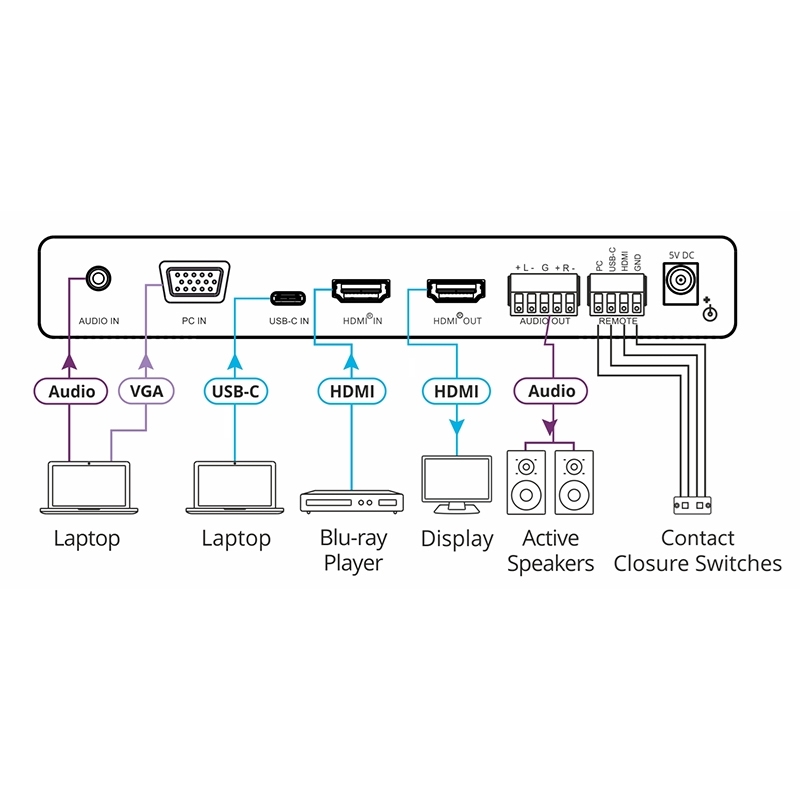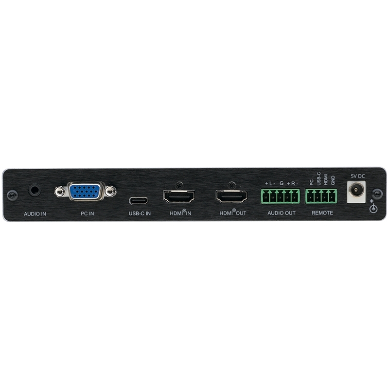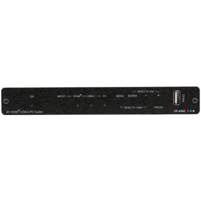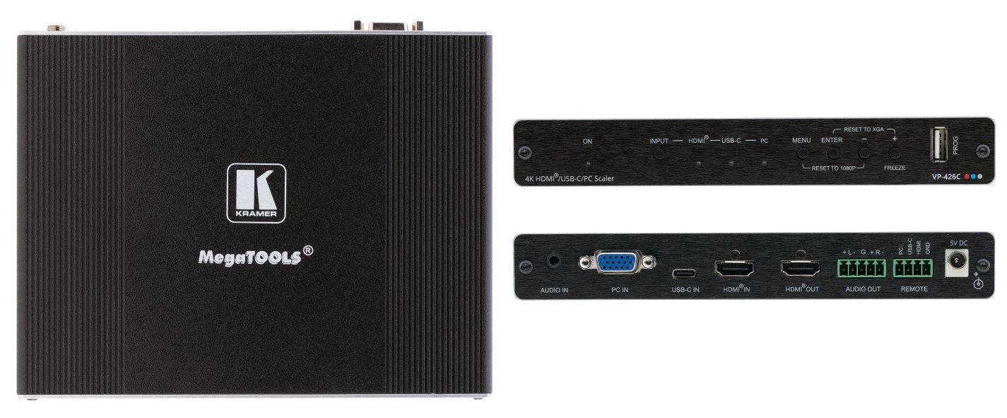 VP-426C — масштабатор сигналов VGA, HDMI и USB-C в сигнал HDMI. Прибор производит понижающее или повышающее (в пределах разрешения 4K@60 Гц 4:4:4) масштабирование одного из выбранных видеосигналов. Пользователь выбирает один из двух входов: HDMI или USB-C, и сигнал с выбранного входа после обработки и масштабирования поступает на выход HDMI.