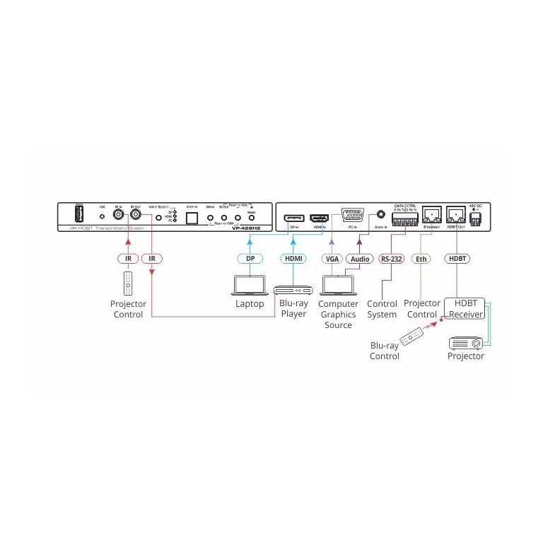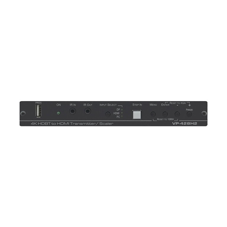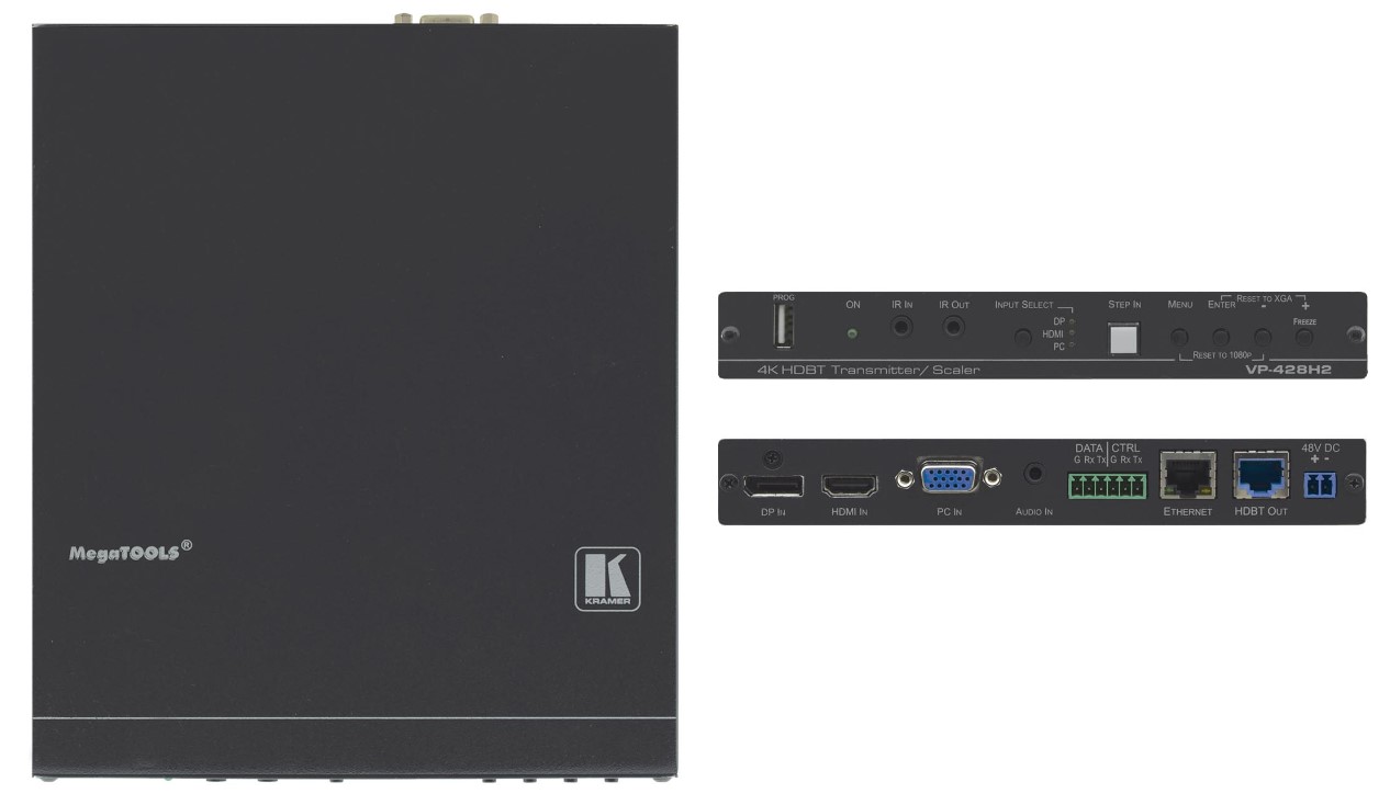 VP-428H2 — передатчик HDBaseT/масштабатор с переключаемыми входами HDMI, DisplayPort и VGA. Прибор осуществляет повышающее или понижающее масштабирование аудио-видео сигнала с выбранного входа или оставляет сигнал без изменения в соответствие с пользовательскими настройками, после чего преобразует его в сигнал формата HDBaseT, предназначенного для передачи по кабелю типа «витая пара». Одновременно с этим прибор осуществляет туннелирование сигнала Ethernet, двунаправленных сигналов RS−232 и ИК в линию HDBaseT, а также может выступать в качестве источника питания PoE для удалённого приёмника HDBaseT. VP-428H2 поддерживает разрешение 4K@60 Гц (4:4:4) на входах HDMI и DisplayPort, и 4K@60 Гц (4:2:0) на выходе HDBaseT, а также функцию выбора входа на удалённом коммутаторе по технологии Step-In.