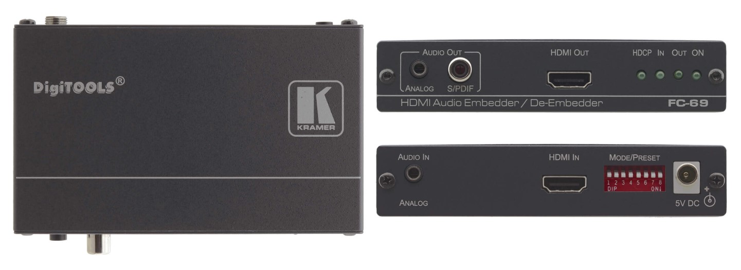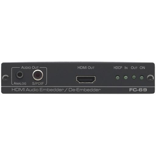FC-69 — эмбедер/деэмбедер аудио из сигнала HDMI c разрешением до 4K@60 Гц (4:2:0). Прибор производит эмбедирование аудио в сигнал HDMI, деэмбедирование аудио как из сигнала HDMI, так и обратного аудиоканала (ARC) и осуществляет вывод аудио одновременно на цифровой разъем S/PDIF и аналоговый небалансный стерео разъем mini-jack 3,5 мм.