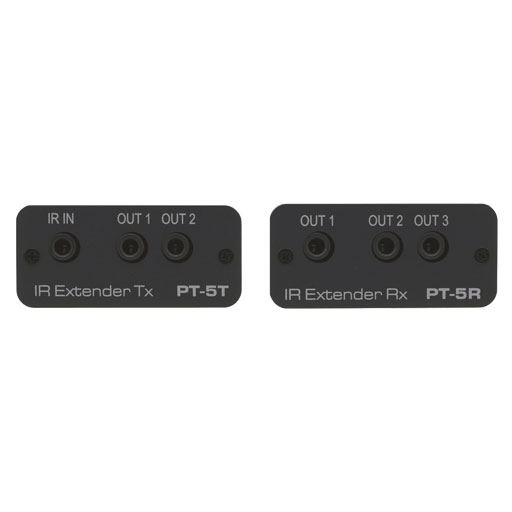 PT-5R/T – комплект передатчик/приемник для передачи ИК-сигналов по кабелю витой пары. Передатчик PT-5T преобразует ИК-сигнал в сигнал, передаваемый по витой паре. Приемник PT-5R осуществляет обратное преобразование сигнала, поступающего по кабелю витой пары, в ИК-сигнал, поступающий на 3 отдельных выхода (в дополнение к 2 локальным выходам на передатчике PT-5T).