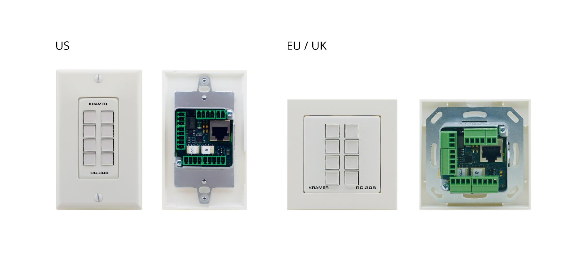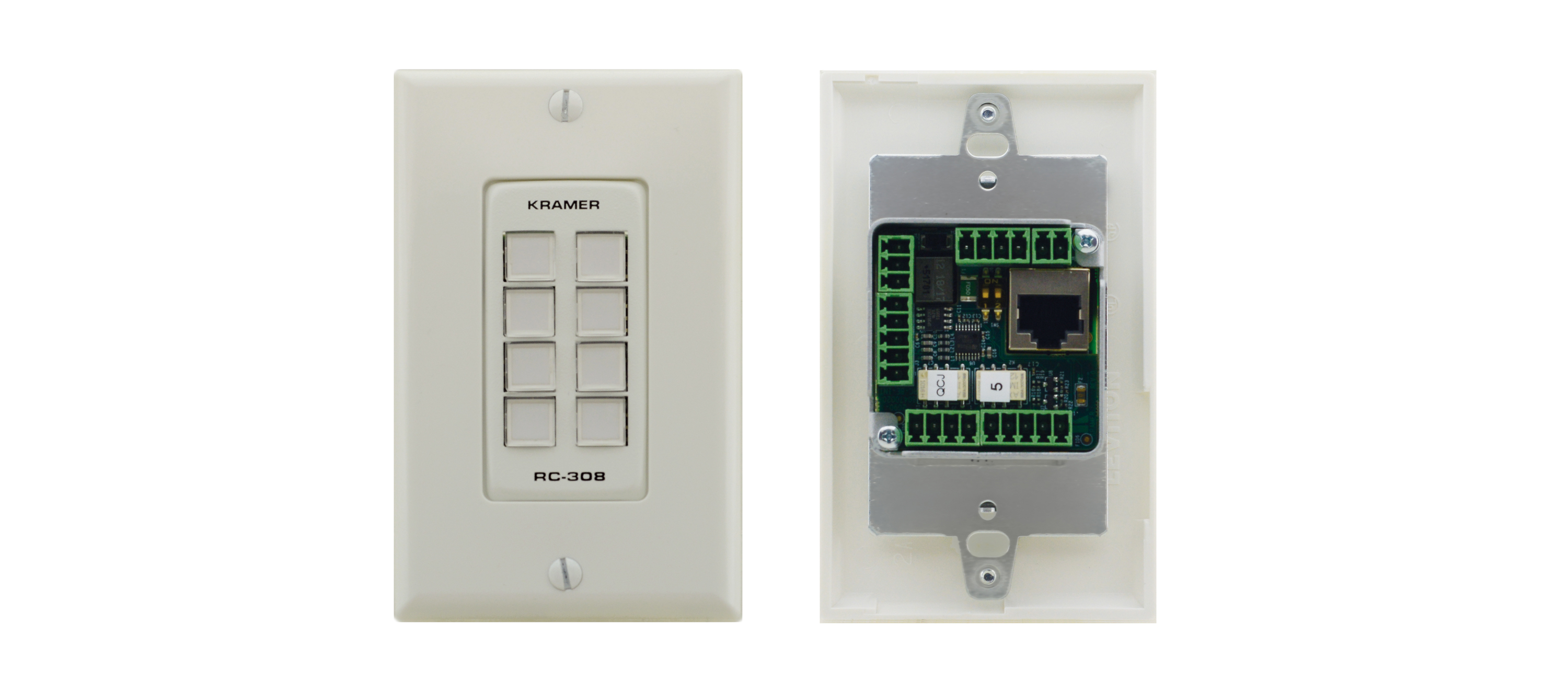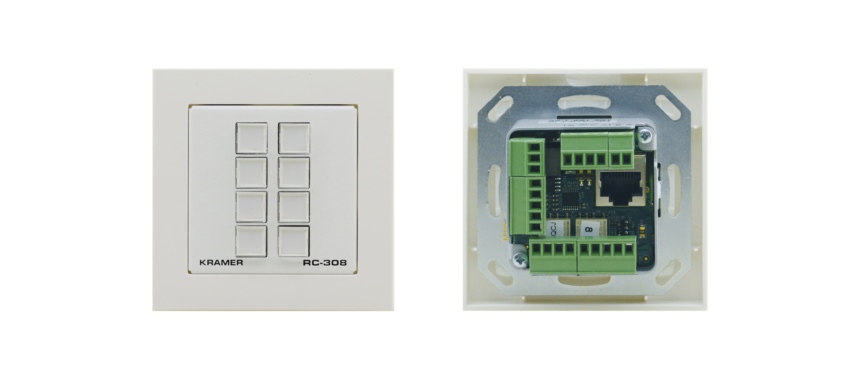 RC-308 — 8-кнопочная панель управления cо встроенным контроллером помещения в вариантах исполнения US-D и EU и функцией питания PoE по кабелю Ethernet. Панель RC-308 предназначена для использования в качестве устройства управления как аудио и видео оборудованием, так и проекционными экранами, моторизованными шторами и прочим оборудованием помещения. Управление осуществляется посредством интерфейсов Ethernet, RS-232, RS-485, GPI/O, ИК и замыкания сухих контактов реле. Также имеется интерфейс K-NET™, позволяющий подключать вспомогательные кнопочные панели или контроллеры помещения. Таким образом, панель может являться как отдельным самостоятельным контроллером помещения, так и одним из компонентов системы управления K-NET™, а также пользовательским интерфейсом в составе платформы Kramer Control.