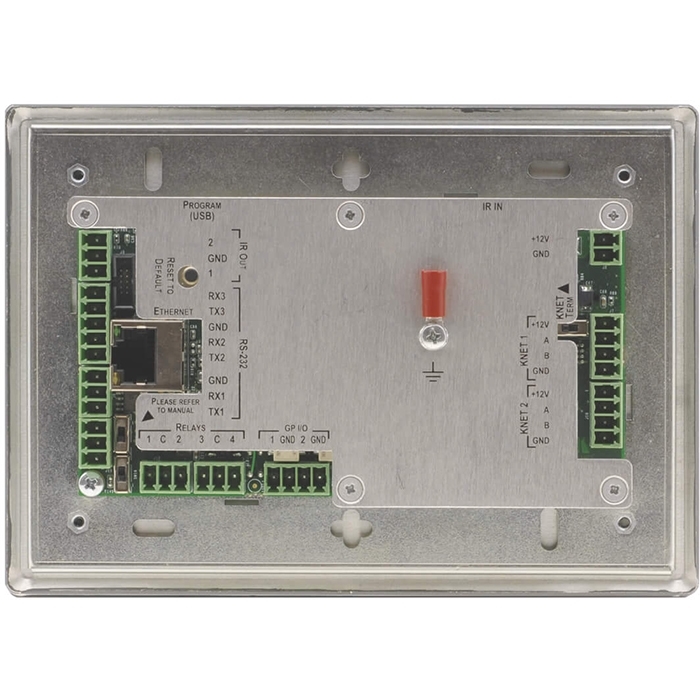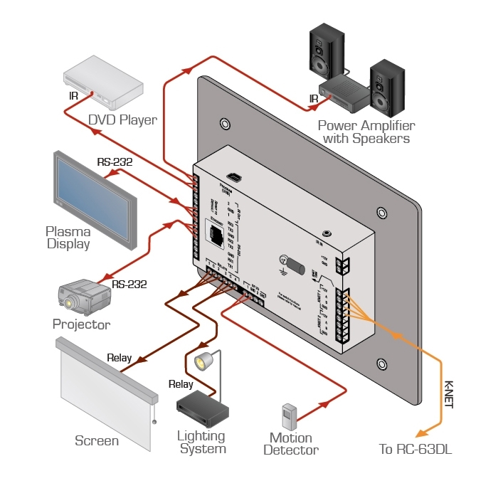 - Интерфейсы управления: 3 порта RS-232 для управления мультимедийным оборудованием 1 порт RS-485 для управления мультимедийным оборудованием 2 порта K-NET™ для подключения внешнего контроллера помещения и вспомогательных кнопочных панелей для удаленного управления. Помимо передачи сигналов управления шина K-NET™ служит для обеспечения питания связанных устройств 2 порта GPI/O (ввода-вывода общего назначения). Порты конфигурируются в качестве цифрового входа, цифрового выхода или аналогового входа для управления датчиками, запирающими устройствами, регуляторами уровня звука, уровня освещенности и т.д. 2 ИК-порта для подключения ИК-излучателей для управления мультимедийным оборудованием 4 реле для управления моторизованными шторами, экраном, освещением и иными системами и оборудованием помещения 1 порт ИК-датчика, используемого для обучения командам от ИК-пульта ДУ 1 порт Ethernet для управления оборудованием по сети с использованием ПО Kramer Site−CTRL™