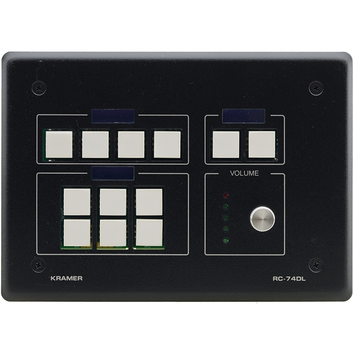 RC-74DL — 12-кнопочная панель управления cо встроенным контроллером помещения в варианте исполнения US, вращающимся цифровым регулятором уровня и отдельными ЖК-дисплеями для трех групп кнопок. Панель RC-74DLN предназначена для использования в качестве устройства управления как аудио и видео оборудованием, так и проекционными экранами, моторизованными шторами и прочим оборудованием помещения. Управление осуществляется посредством интерфейсов RS-232, RS-485, GPI/O, ИК и замыкания сухих контактов реле. Также имеется интерфейс K-NET™, позволяющий подключать вспомогательные кнопочные панели или контроллеры помещения. Таким образом, панель может являться как отдельным самостоятельным контроллером помещения, так и одним из компонентов системы управления K-NET™ или системы на основе сети Ethernet под управлением ПО Kramer Site−CTRL™.