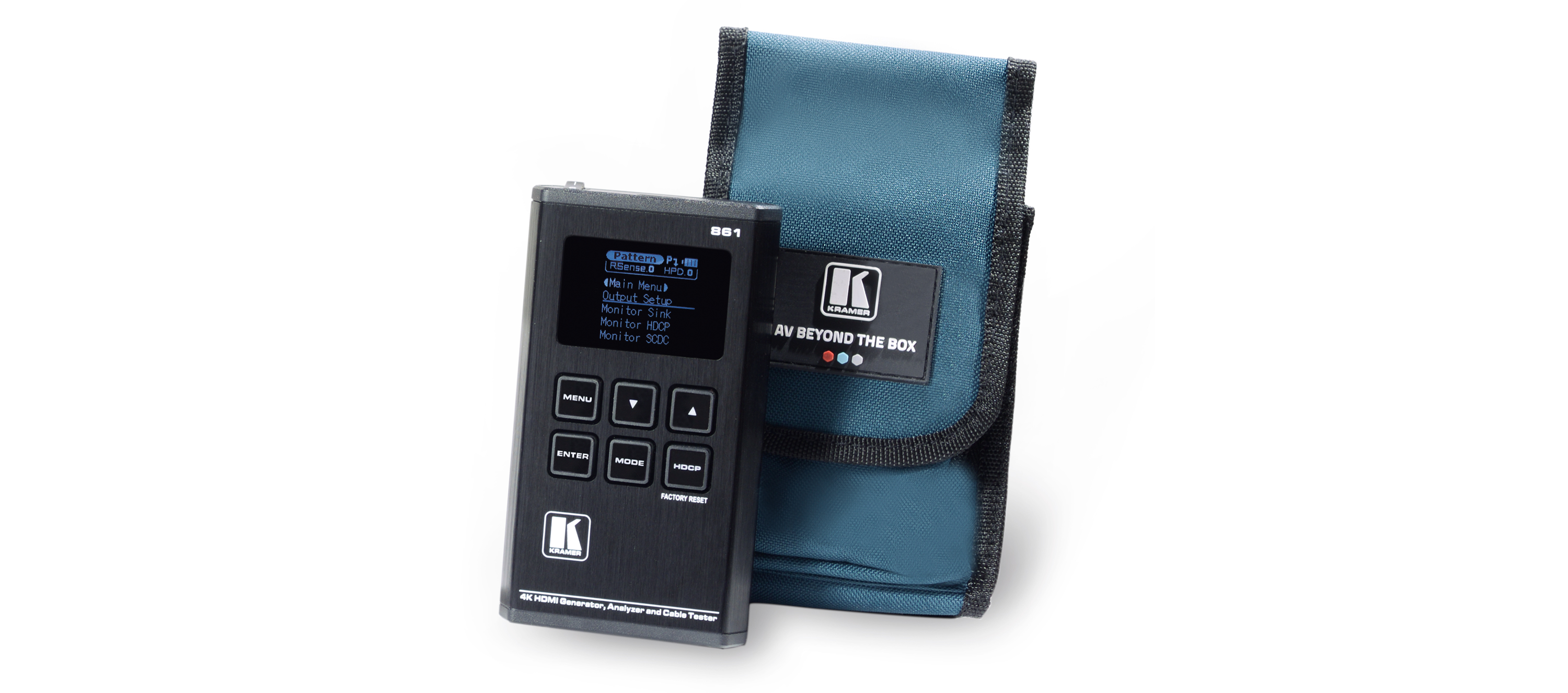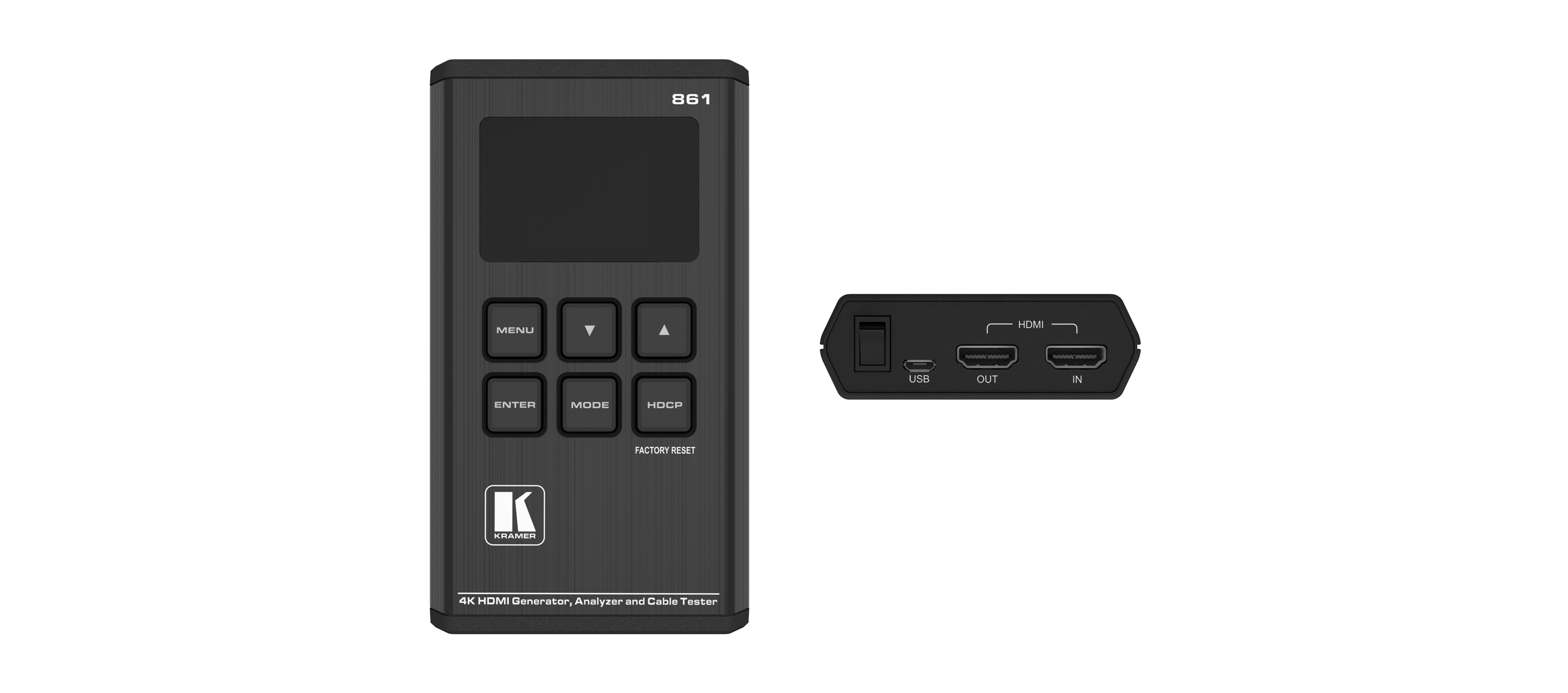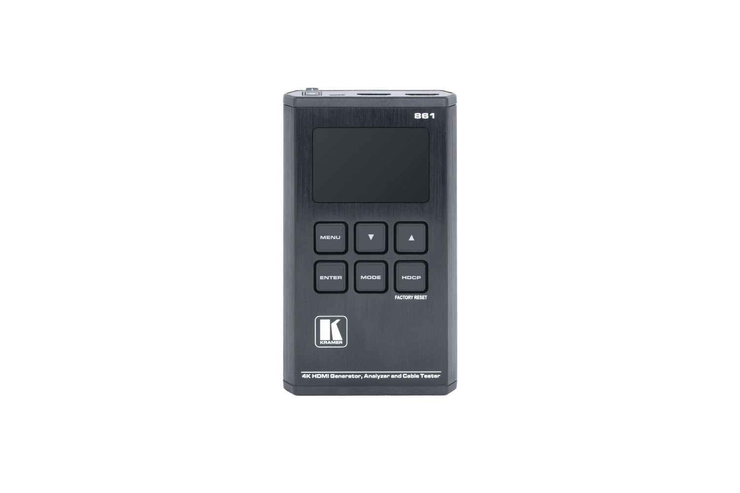 861 — портативный прибор, выполняющий функции генератора испытательных сигналов и анализатора сигнала 4K HDMI HDR cо скоростью передачи видеоданных до 18 Гбит/с (6 Гбит/с на один канал), а также тестера кабелей HDMI. Прибор помогает выявлять и устранять проблемы в тракте прохождения сигнала HDMI разрешением до 4K@60 Гц (4:4:4) с кодированием HDCP 1.4 / 2.2. В устройстве предусмотрен выбор из 23 значений разрешения видеосигнала и 11 видов испытательных изображений, а также более десятка различных типов анализа аудио-видео характеристик. Поддерживаются функции анализа пакетов данных HDMI, включения / выключения поддержки HDCP, а также функции анализа, загрузки и эмуляции данных EDID. В дополнение к вышеуказанным возможностям имеется функция мониторинга служебного канала SCDC, позволяющая определять наличие и проводить анализ сигналов HDMI cо скоростью передачи видеоданных до 18 Гбит/с. В приборе также имеется генератор до 8 каналов испытательного тона LPCM в широком диапазоне частот и уровней аудиосигнала. Прибор 861, выполненный в прочном портативном корпусе, может помещаться в высококачественный мягкий поясной чехол, который входит в комплект поставки. Питание прибора осуществляется от литий-ионного аккумулятора, время работы без подзарядки составляет более 5часов.