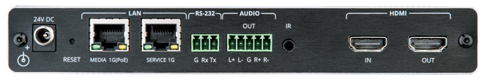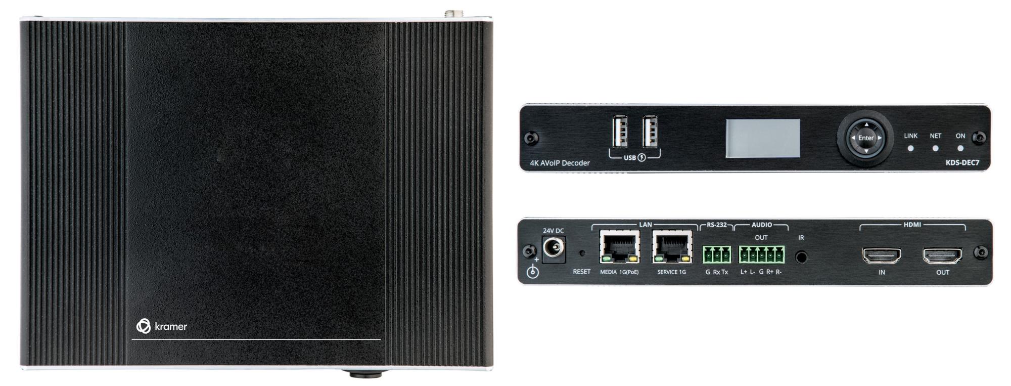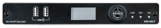 KDS-DEC7 — декодер и приёмник из сети Ethernet сигналов HDMI разрешением до 4K@60 Гц (4:2:0), аудио, RS-232, ИК и USB. KDS-DEC7 производит преобразование цифрового потока, передаваемого по сети IP на основе медной витой пары в режиме Unicast или Multicast, в исходный сигнал HDMI с деэмбедированием аудио, а также сигналы RS-232, ИК и USB. В качестве совместимых передатчиков/кодеров цифрового потока могут использоваться приборы KDS-EN7, KDS-SW2-EN7, KDS-SW3-EN7 и WP-SW2-EN7.