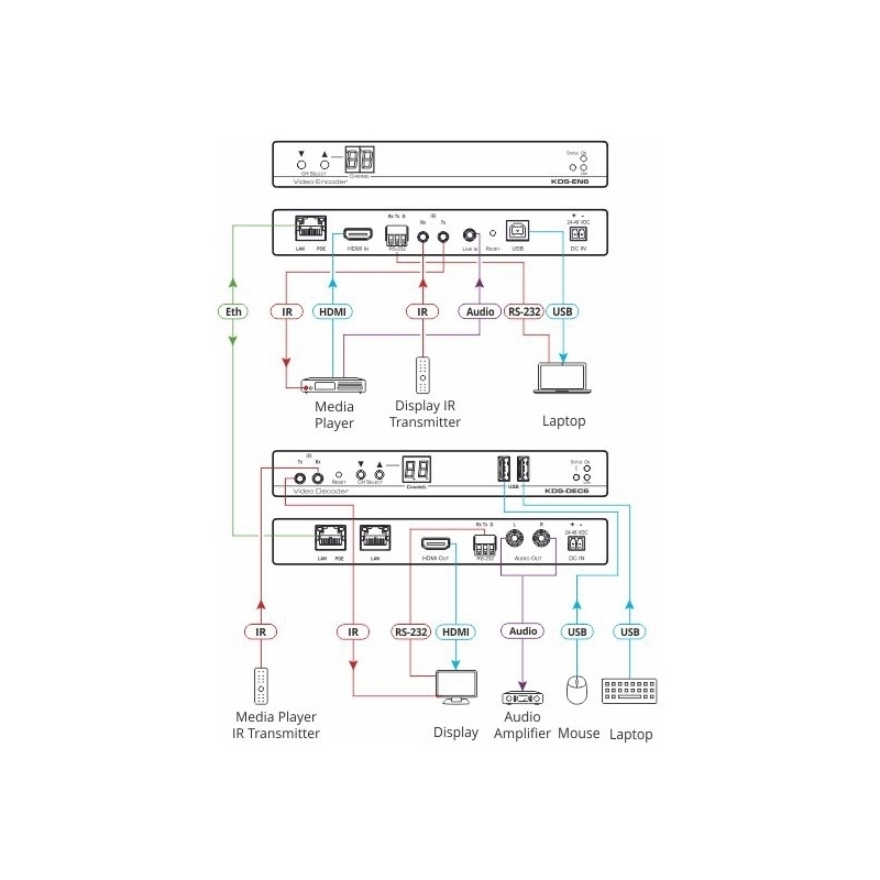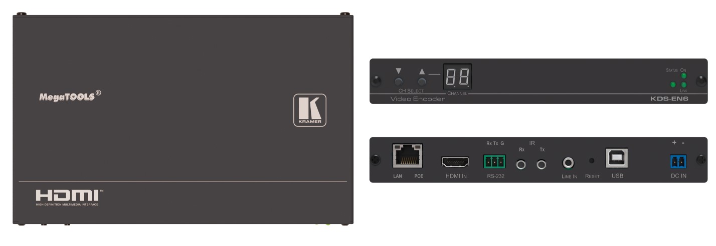KDS-EN6 — кодер и передатчик в сеть Ethernet сигналов HDMI с разрешением до 4K@60 Гц (4:2:0), аудио, RS-232, ИК и USB. KDS-EN6 производит преобразование сигналов HDMI, эмбедированного аудио, RS-232, ИК и USB в цифровой поток, передаваемый по сети IP на основе медной витой пары в режиме Unicast или Multicast. В качестве совместимого приёмника/декодера цифрового потока может использоваться прибор KDS-DEC6.