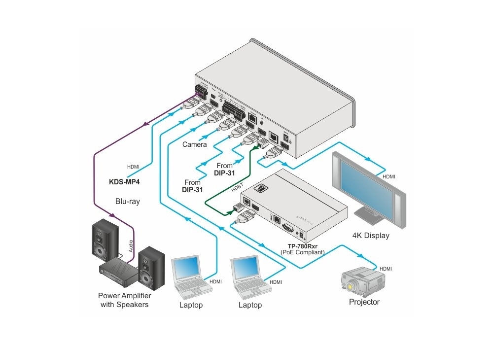 - Возможность удаленного выбора входа коммутатора по технологии Step-in с использованием совместимых устройств, например, SID-X3N, DIP-30, DIP-31M, и кабеля HDMI версии 1.4 с поддержкой Ethernet-канала