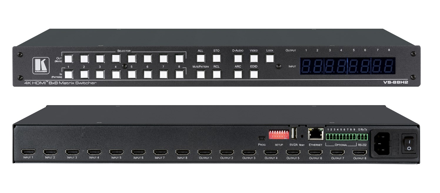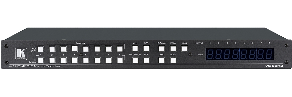 VS-88H2 — матричный коммутатор 8х8 сигналов HDMI c поддержкой разрешений до 4K@60 Гц (4:4:4 ) и технологии HDR. Прибор осуществляет перетактирование входного сигнала, компенсацию АЧХ кабеля и переключение сигнала HDMI от любого из восьми источников сигнала (в т.ч. поддерживающих HDCP-кодирование), на любой из восьми выходов HDMI или на любые комбинации выходов. VS-88H2 обладает непревзойденной гибкостью коммутации аудиосигналов, позволяя переключать любой эмбедированный цифровой аудиосигнал на любой цифровой выход в дополнение к восьми источникам обратного аудиоканала (ARC), что эквивалентно аудиоматрице размерностью 16x16. ВНИМАНИЕ! Для гарантированного получения необходимых результатов (воспроизведения видео с нужным разрешением, правильными пропорциями изображения, корректной передачей цвета и т.д.) ОБЯЗАТЕЛЬНО выполните процедуру считывания EDID (см. соответствующий раздел Руководства по эксплуатации прибора).