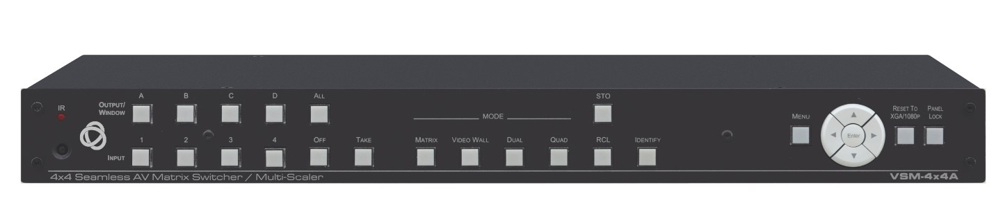 VSM—4X4A — матричный коммутатор 4х4 сигналов HDMI с разрешением до 1080p@60 Гц, имеющий балансные и небалансные аудиовыходы для каждого выхода HDMI. Благодаря встроенным масштабаторам на каждом входе прибор осуществляет переключение входных сигналов «кадр-в-кадр», без подрывов изображения на выходе. Наличие масштабаторов также позволяет устройству работать в режиме контроллера видеостены 2х2 или 1х4, осуществлять режим PnP (картинка + картинка) и PiP (картинка в картинке), а также режим мультивьюера (квадратора). Прибор осуществляет перетактирование входного сигнала и компенсацию АЧХ входного кабеля на каждом из четырех входов.