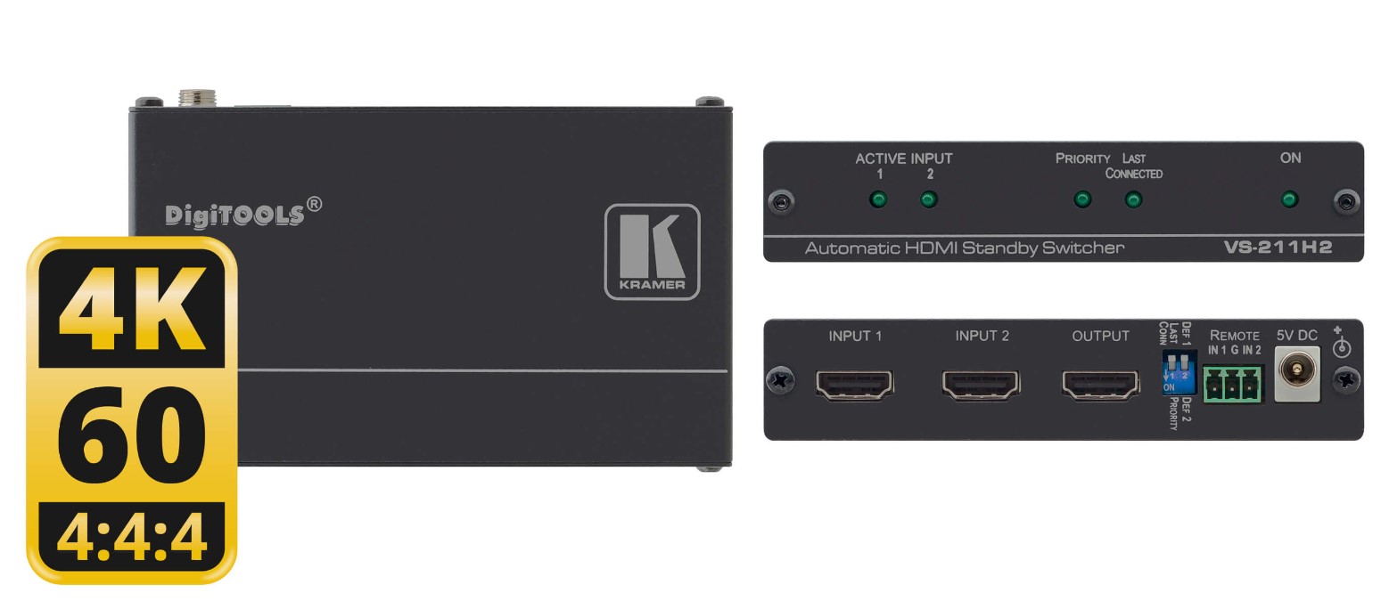 VS-211H2 — коммутатор 2х1 HDMI c автоматическим переключением входов по наличию сигнала с поддержкой разрешений до 4K@60 Гц (4:4:4) и технологии HDR. Выбор одного из двух режимов автоматического переключения: на вход с приоритетом или вход с последним по времени подключения источником сигнала. Возможность дистанционного ручного переключения входов.