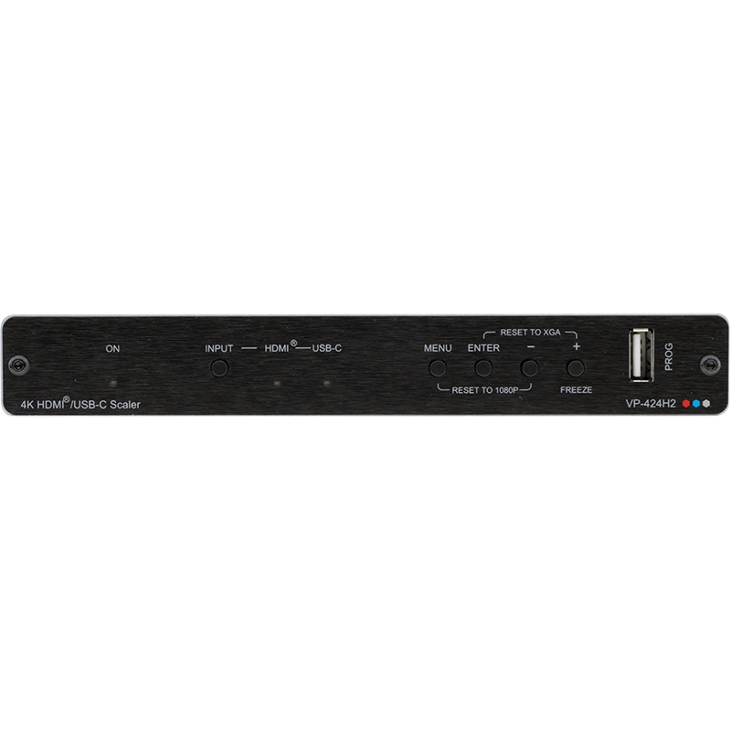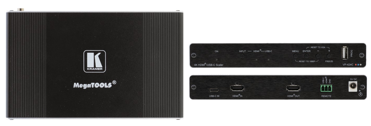 VP-424C — масштабатор сигналов HDMI и USB-C в сигнал HDMI. Прибор производит понижающее или повышающее (в пределах разрешения 4K@60 Гц 4:4:4) масштабирование одного из выбранных видеосигналов. Пользователь выбирает один из двух входов: HDMI или USB-C, и сигнал с выбранного входа после обработки и масштабирования поступает на выход HDMI.