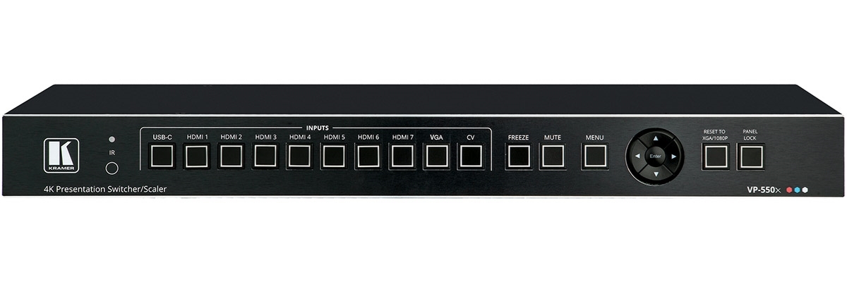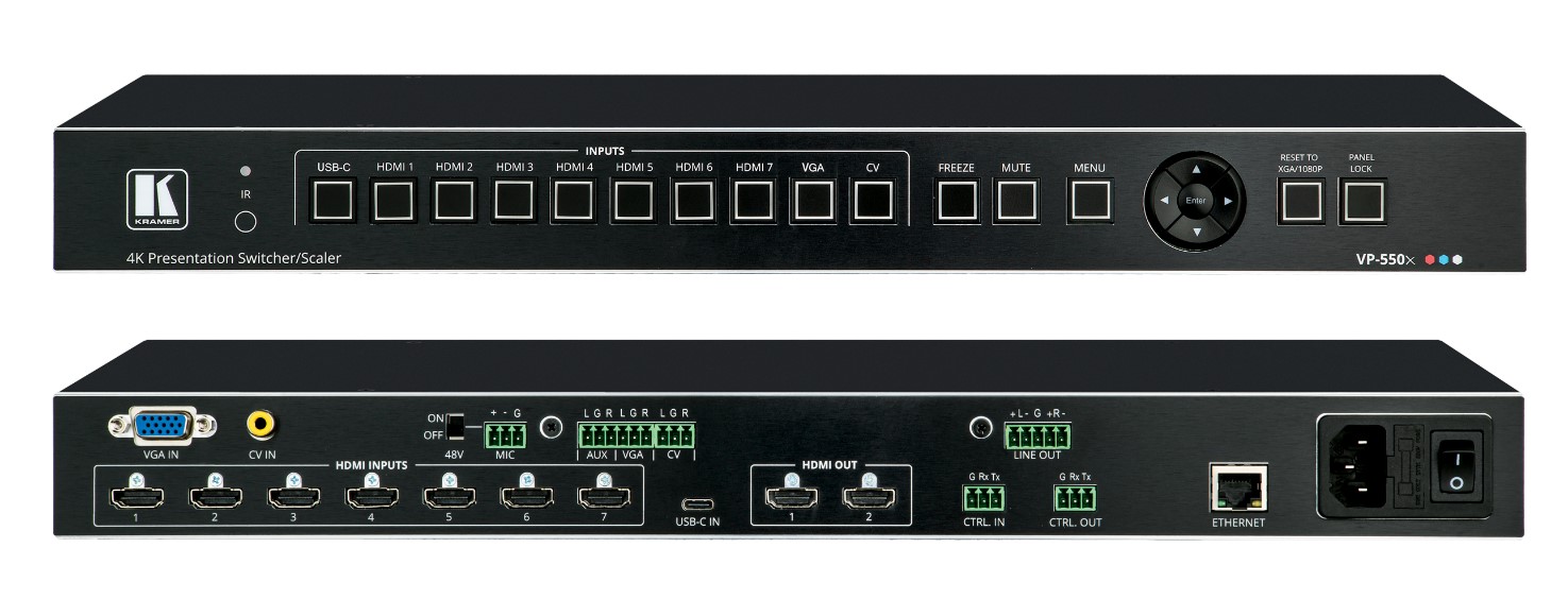 VP-550X — 10-входовой презентационный масштабатор/коммутатор сигналов HDMI, USB-C, VGA и CV. Прибор производит понижающее или повышающее (в пределах разрешения 4K@60 Гц 4:4:4) масштабирование одного из выбранных видеосигналов с выводом на два дублирующих выхода HDMI. В устройстве имеются отдельные линейные входы аудио для каждого типа входных видеосигналов, а также микрофонный вход с фантомным питанием. Имеется возможность эмбедирования аудио в HDMI, а также деэмбедирования с выводом на балансный стерео аудиовыход.