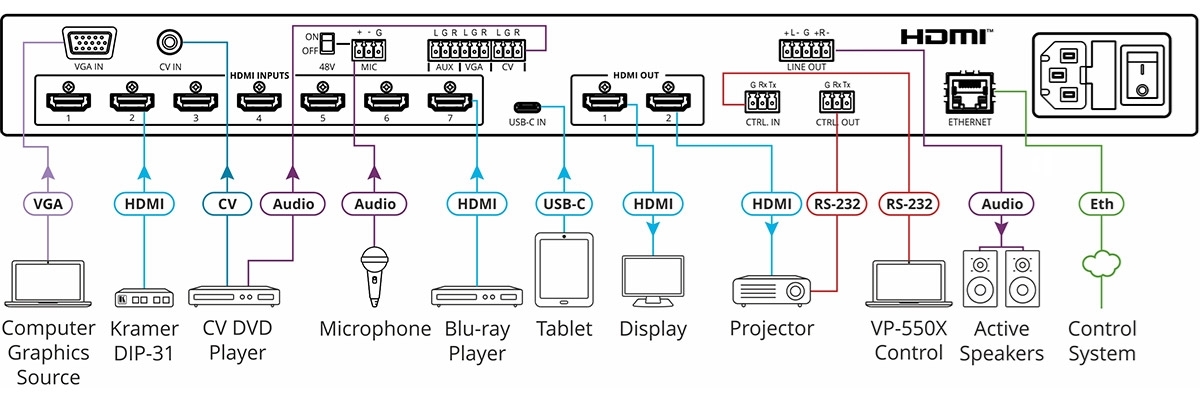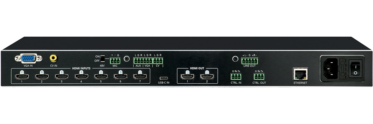 - Широкий набор входов: 7 HDMI и 1 USB-C 4K 4K@60 Гц (4:4:4), а также 1 VGA и 1 CV